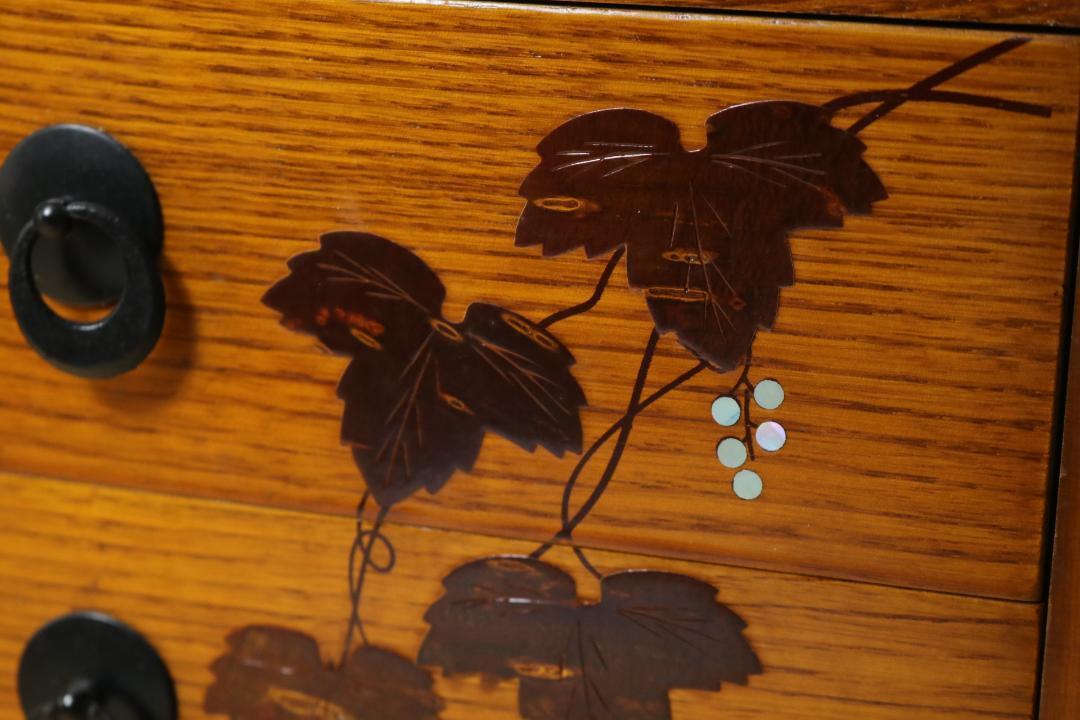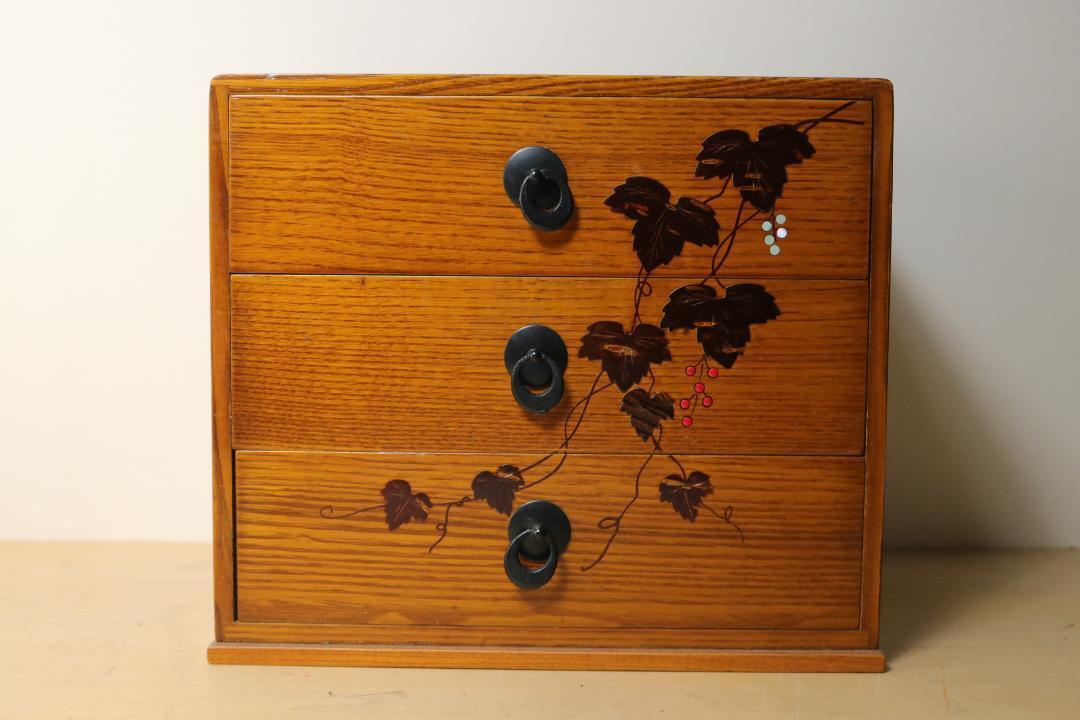 素朴な木肌に、愛らしいぶどうの象嵌細工が施された三段の小引出しです。引き手は鉄製で、全体に趣のある佇まい。日本の古き良き手仕事を感じさせる逸品です。