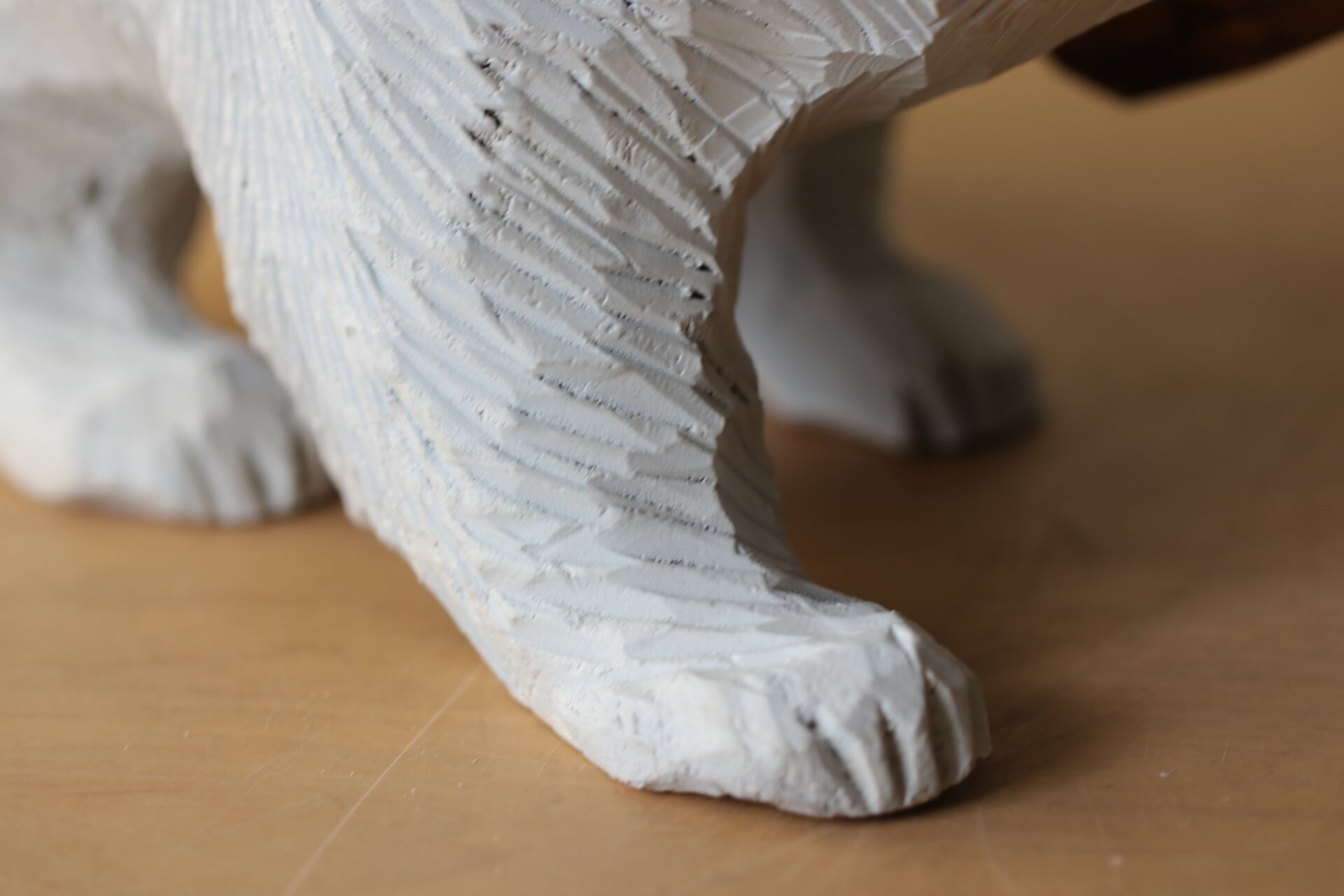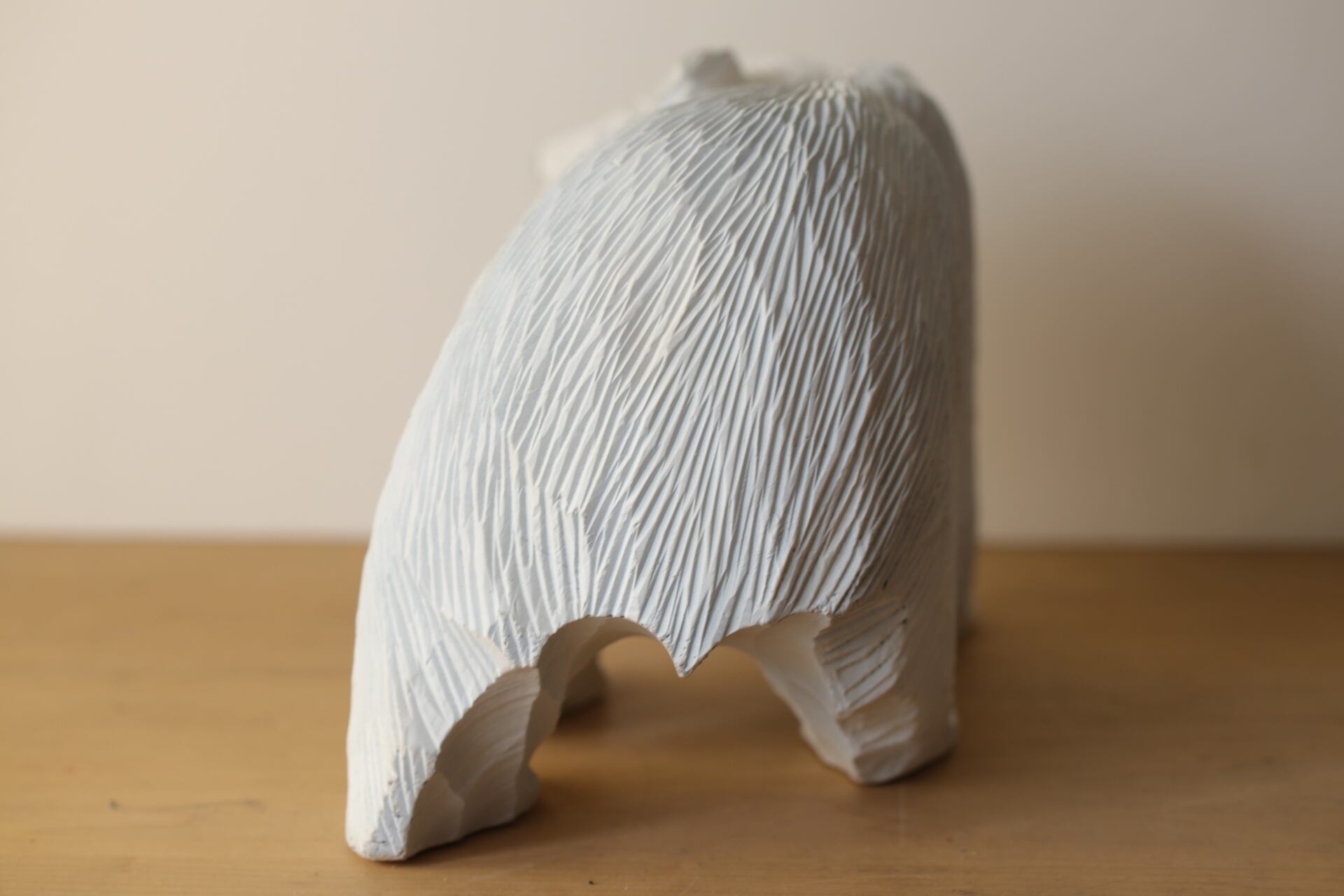 古き良き北海道の民芸品である木彫りの熊を、潔くホワイトにリペイント。 力強い毛並みの造形はそのままに、色を塗り替えることで、どこかシロクマのような愛らしさと、現代アートのような洗練された佇まいが生まれました。